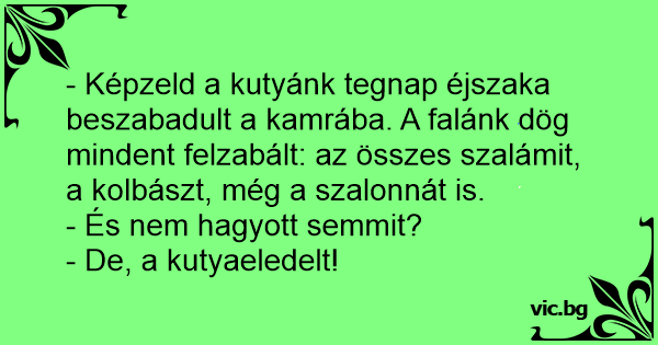 - Képzeld a kutyánk tegnap éjszaka beszabadult a kamrába. A falánk dög mindent felzabált: az összes szalámit, a kolbászt, még a szalonnát is.