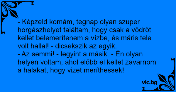 - Képzeld komám, tegnap olyan szuper horgászhelyet találtam, hogy csak a vödröt kellet belemerítenem a vízbe, és máris tele volt hallal! - dicsekszik az egyik.