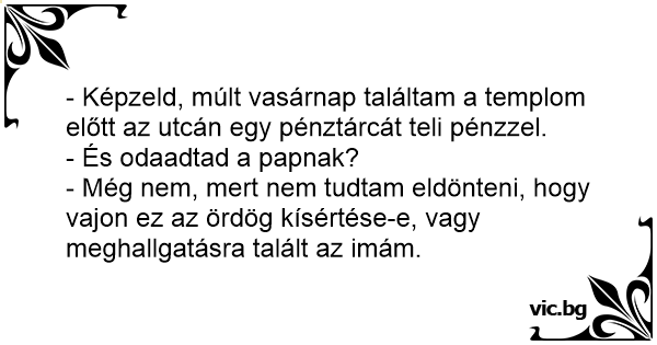 - Képzeld, múlt vasárnap találtam a templom előtt az utcán egy pénztárcát teli pénzzel.
