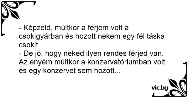 - De jó, hogy neked ilyen rendes férjed van. Az enyém múltkor a konzervatóriumban volt és egy konzervet sem hozott...