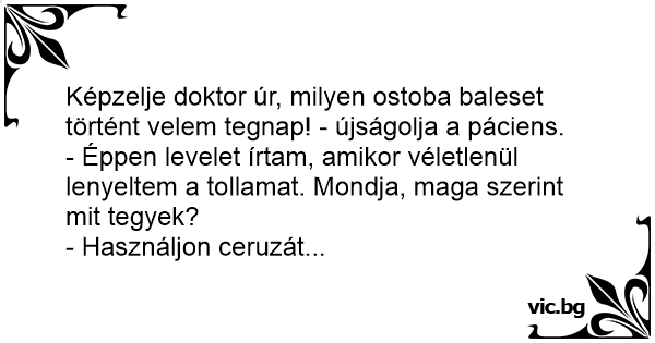 - Éppen levelet írtam, amikor véletlenül lenyeltem a tollamat. Mondja, maga szerint mit tegyek?