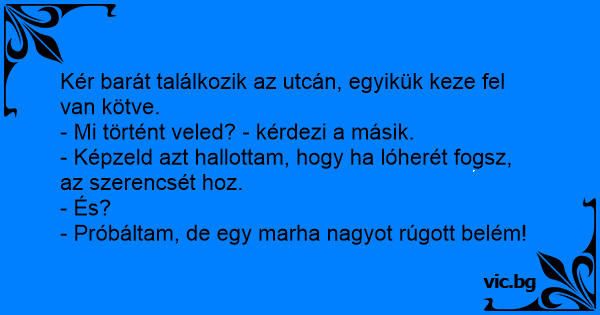 Kér barát találkozik az utcán, egyikük keze fel van kötve.<br />- Mi történt veled? - kérdezi a másik.<br />- Képzeld azt hallottam, hogy ha lóherét fogsz, az szerencsét hoz.<br />- És?<br />- Próbáltam, de egy marha nagyot rúgott belém!