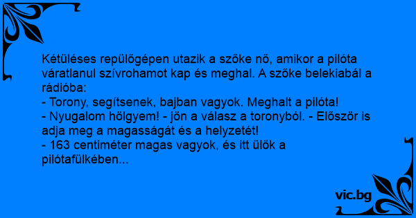 - Nyugalom hölgyem! - jön a válasz a toronyból. - Először is adja meg a magasságát és a helyzetét!