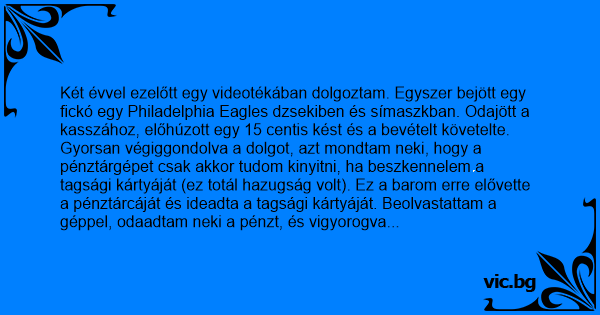 Két évvel ezelőtt egy videotékában dolgoztam. Egyszer bejött egy fickó egy Philadelphia Eagles dzsekiben és símaszkban. Odajött a kasszához, előhúzott egy 15 centis kést és a bevételt követelte.
