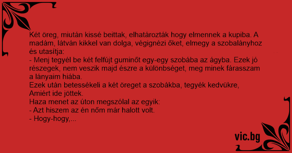 - Menj tegyél be két felfújt guminőt egy-egy szobába az ágyba. Ezek jó részegek, nem veszik majd észre a különbséget, meg minek fárasszam a lányaim hiába.