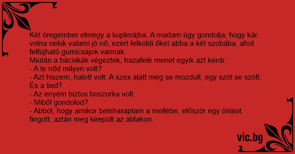 Két öregember elmegy a kuplerájba. A madam úgy gondolja, hogy kár volna nekik valami jó nő, ezért felküldi őket abba a két szobába, ahol felfújható gumicsajok vannak.
