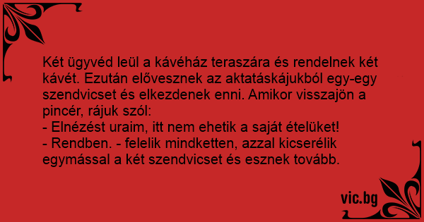 Két ügyvéd leül a kávéház teraszára és rendelnek két kávét. Ezután elővesznek az aktatáskájukból egy-egy szendvicset és elkezdenek enni. Amikor visszajön a pincér, rájuk szól: