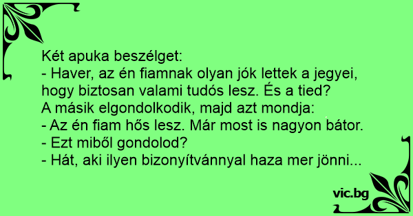 - Haver, az én fiamnak olyan jók lettek a jegyei, hogy biztosan valami tudós lesz. És a tied?