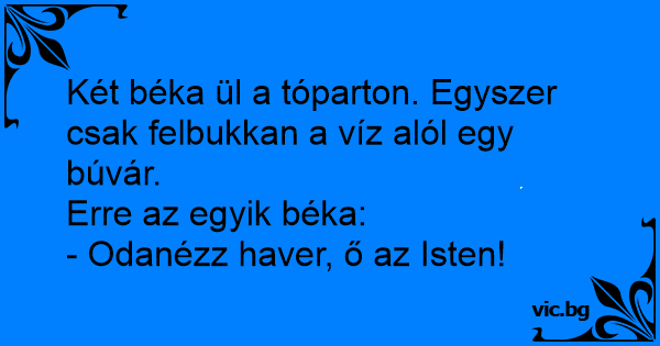 Két béka ül a tóparton. Egyszer csak felbukkan a víz alól egy búvár.<br />Erre az egyik béka:<br />- Odanézz haver, ő az Isten!
