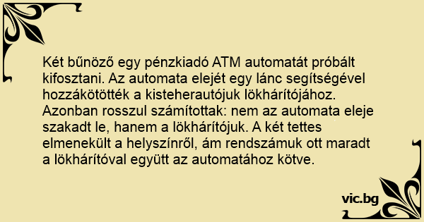 Két bűnöző egy pénzkiadó ATM automatát próbált kifosztani. Az automata elejét egy lánc segítségével hozzákötötték a kisteherautójuk lökhárítójához. Azonban rosszul számítottak: nem az automata eleje szakadt le, hanem a lökhárítójuk. A két tettes elmenekült a helyszínről, ám rendszámuk ott maradt a lökhárítóval együtt az automatához kötve.