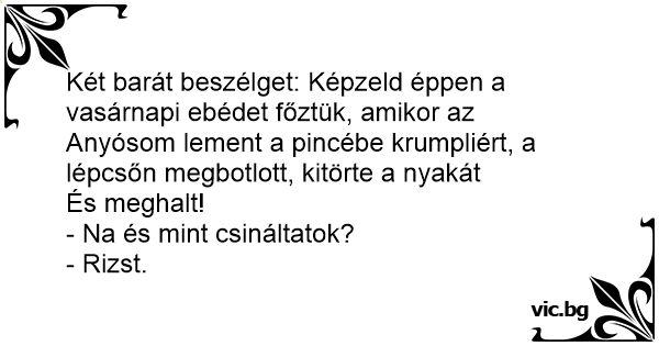 Két barát beszélget: Képzeld éppen a vasárnapi ebédet főztük, amikor az