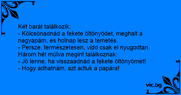 Két ismerős fickó találkozik: - Légy szíves add kölcsön a fekete öltönyödet, mert meghalt a nagyapám! - Persze, természetesen, vidd csak. Néhány nap múlva megint találkoznak: - Te haver, ideje ha...