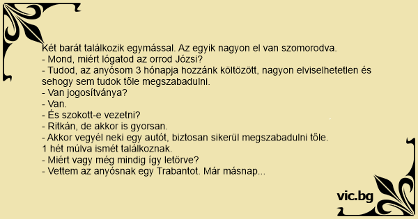 - Vettem az anyósnak egy Trabantot. Már másnap összetörte, de ő megúszta egyetlen karcolás nélkül.