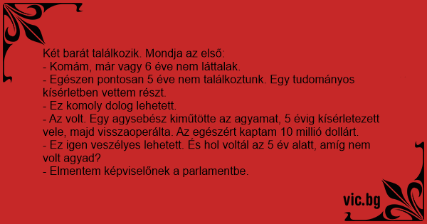 - Az volt. Egy agysebész kiműtötte az agyamat, 5 évig kísérletezett vele, majd visszaoperálta. Az egészért kaptam 10 millió dollárt.