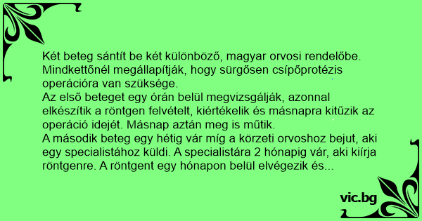Két beteg sántít be két különböző, magyar orvosi rendelőbe. Mindkettőnél megállapítják, hogy sürgősen csípőprotézis operációra van szüksége.