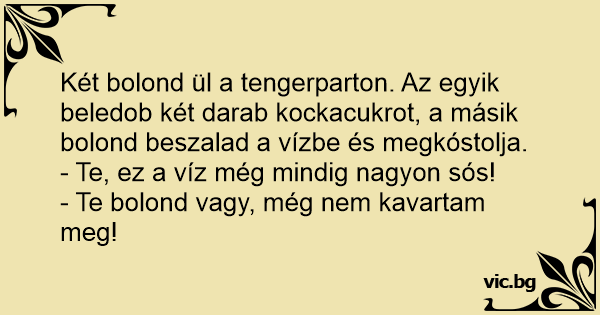 Két bolond ül a tengerparton. Az egyik beledob két darab kockacukrot, a másik bolond beszalad a vízbe és megkóstolja.