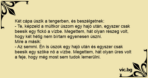 Két cápa úszik a tengerben, és beszélgetnek: