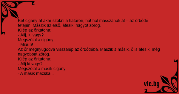 Két cigány át akar szökni a határon, hát hol másszanak át – az őrbódé tetején. Mászik az első, átesik, nagyot zörög.