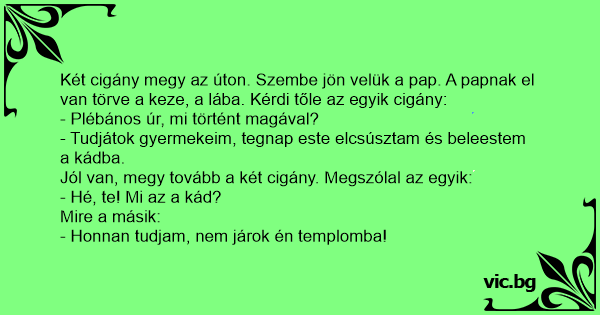Két cigány megy az úton. Szembe jön velük a pap. A papnak el van törve a keze, a lába. Kérdi tőle az egyik cigány: