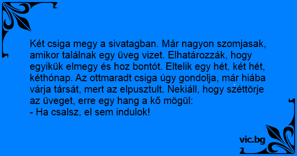 Két csiga megy a sivatagban. Már nagyon szomjasak, amikor találnak egy üveg vizet. Elhatározzák, hogy egyikük elmegy és hoz bontót. Eltelik egy hét, két hét, kéthónap. Az ottmaradt csiga úgy gondolja, már hiába várja társát, mert az elpusztult. Nekiáll, hogy széttörje az üveget, erre egy hang a kő mögül: