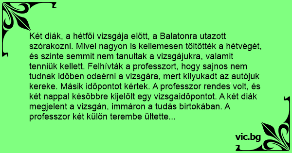 Két diák, a hétfői vizsgája előtt, a Balatonra utazott szórakozni. Mivel nagyon is kellemesen töltötték a hétvégét, és szinte semmit nem tanultak a vizsgájukra, valamit tenniük kellett. Felhívták a professzort, hogy sajnos nem tudnak időben odaérni a vizsgára, mert kilyukadt az autójuk kereke. Másik időpontot kértek. A professzor rendes volt, és két nappal későbbre kijelölt egy vizsgaidőpontot. A két diák megjelent a vizsgán, immáron a tudás birtokában. A professzor két külön terembe ültette őket, majd átadta a vizsgalapokat.