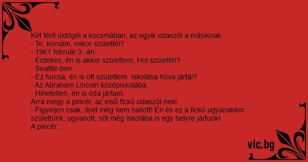 - Figyeljen csak, ilyet még nem hallott! Én és ez a fickó ugyanakkor születtünk, ugyanott, sőt még iskolába is egy helyre jártunk!