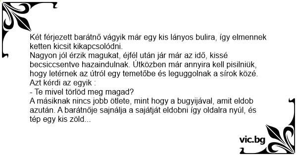 Nagyon jól érzik magukat, éjfél után jár már az idő, kissé becsiccsentve hazaindulnak. Útközben már annyira kell pisilniük, hogy letérnek az útról egy temetőbe és leguggolnak a sírok közé. Azt kérdi az egyik :