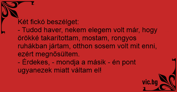 - Érdekes, - mondja a másik - én pont ugyanezek miatt váltam el!