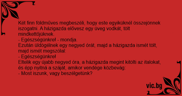 Két finn földműves megbeszéli, hogy este egyiküknél összejönnek iszogatni. A házigazda elővesz egy üveg vodkát, tölt mindkettőjüknek.