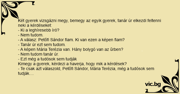 Két gyerek vizsgázni megy, bemegy az egyik gyerek, tanár úr elkezdi feltenni neki a kérdéseket: