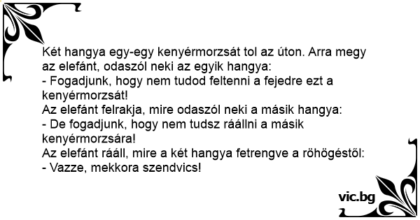 Két hangya egy-egy kenyérmorzsát tol az úton. Arra megy az elefánt, odaszól neki az egyik hangya: