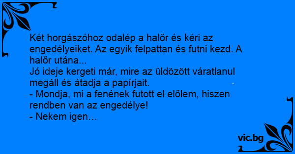 Két horgászóhoz odalép a halőr és kéri az engedélyeiket. Az egyik felpattan és futni kezd. A halőr utána...
