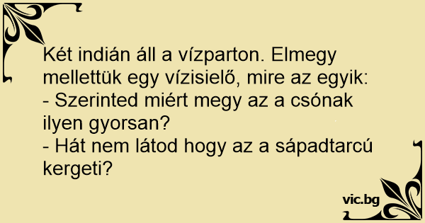 Két indián áll a vízparton. Elmegy mellettük egy vízisielő, mire az egyik: - Szerinted miért megy az a csónak ilyen gyorsan? - Hát nem látod hogy az a sápadtarcú kergeti?