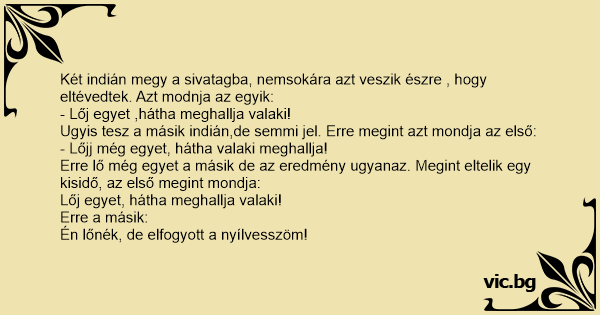Két indián megy a sivatagba, nemsokára azt veszik észre , hogy eltévedtek. Azt modnja az egyik: - Lőj egyet ,hátha meghallja valaki! Ugyis tesz a másik indián,de semmi jel. Erre megint azt mondja az első: - Lőjj még egyet, hátha valaki meghallja! Erre lő még egyet a másik de az eredmény ugyanaz. Megint eltelik egy kisidő, az első megint mondja: Lőj egyet, hátha meghallja valaki! Erre a másik: Én lőnék, de elfogyott a nyílvesszöm!