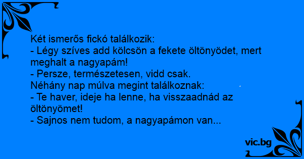 Két barát találkozik: - Kölcsönadnád a fekete öltönyödet, meghalt a nagyapám, és holnap lesz a temetés. - Persze, természetesen, vidd csak el nyugodtan. Három hét múlva megint találkoznak: - Jó...