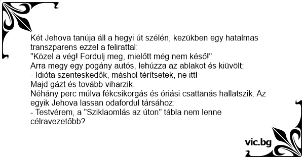 Néhány perc múlva fékcsikorgás és óriási csattanás hallatszik. Az egyik Jehova lassan odafordul társához: