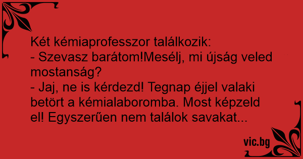 - Jaj, ne is kérdezd! Tegnap éjjel valaki betört a kémialaboromba. Most képzeld el! Egyszerűen nem találok savakat...