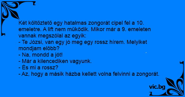 Két költöztető egy hatalmas zongorát cipel fel a 10. emeletre. A lift nem működik. Mikor már a 9. emeleten vannak megszólal az egyik: