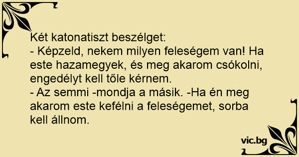 - Képzeld, nekem milyen feleségem van! Ha este hazamegyek, és meg akarom csókolni, engedélyt kell tőle kérnem.