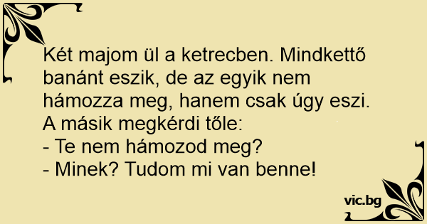 Két majom ül a ketrecben. Mindkettő banánt eszik, de az egyik nem hámozza meg, hanem csak úgy eszi. A másik megkérdi tőle: