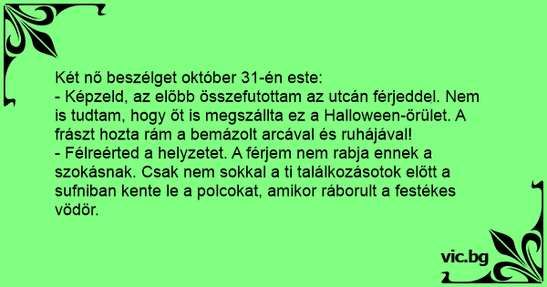 - Képzeld, az előbb összefutottam az utcán férjeddel. Nem is tudtam, hogy őt is megszállta ez a Halloween-őrület. A frászt hozta rám a bemázolt arcával és ruhájával!