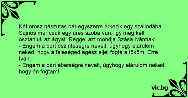 - Engem a párt őszinteségre nevelt, úgyhogy elárulom neked, hogy a feleséged egész éjjel fogta a tököm. Erre Iván: