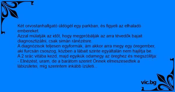 - Elnézést, uram, de a barátom szerint Önnek elmeszesedtek a lábízületei, míg szerintem inkább ízületi gyulladása lehet. Megmondaná, hogy melyikünknek van igaza?