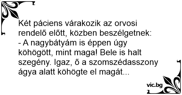 - A nagybátyám is éppen úgy köhögött, mint maga! Bele is halt szegény. Igaz, ő a szomszédasszony ágya alatt köhögte el magát...