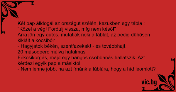 Két pap álldogál az országút szélén, kezükben egy tábla :