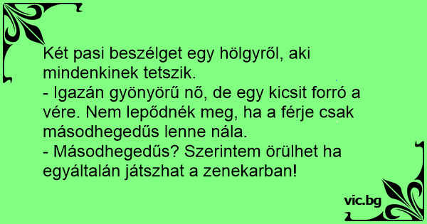 - Nagyon szép asszony a Géza felesége, de szerintem egy kicsit könnyűvérű... Nem lepődnék meg, ha a férje csak a másodhegedűs szerepét játszaná otthon. - Másodhegedűs? Viccelsz?!Szerintem már az is...