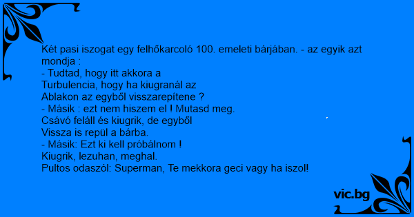 Két pasi iszogat egy felhőkarcoló 100. emeleti bárjában. - az egyik azt mondja :