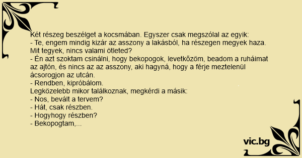 - Te, engem mindig kizár az asszony a lakásból, ha részegen megyek haza. Mit tegyek, nincs valami ötleted?