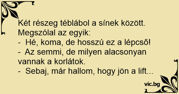 Két részeg téblábol a sínek között. Megszólal az egyik: