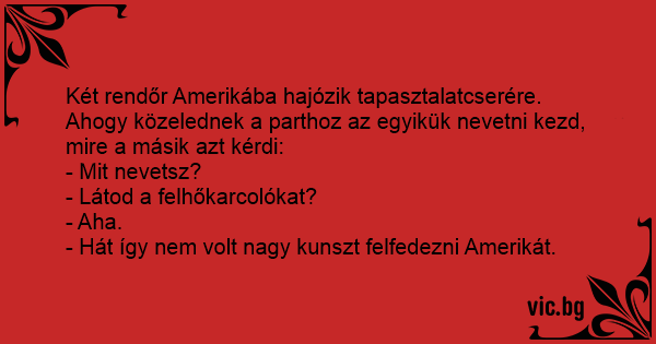 Két rendőr Amerikába hajózik tapasztalatcserére. Ahogy közelednek a parthoz az egyikük nevetni kezd, mire a másik azt kérdi: